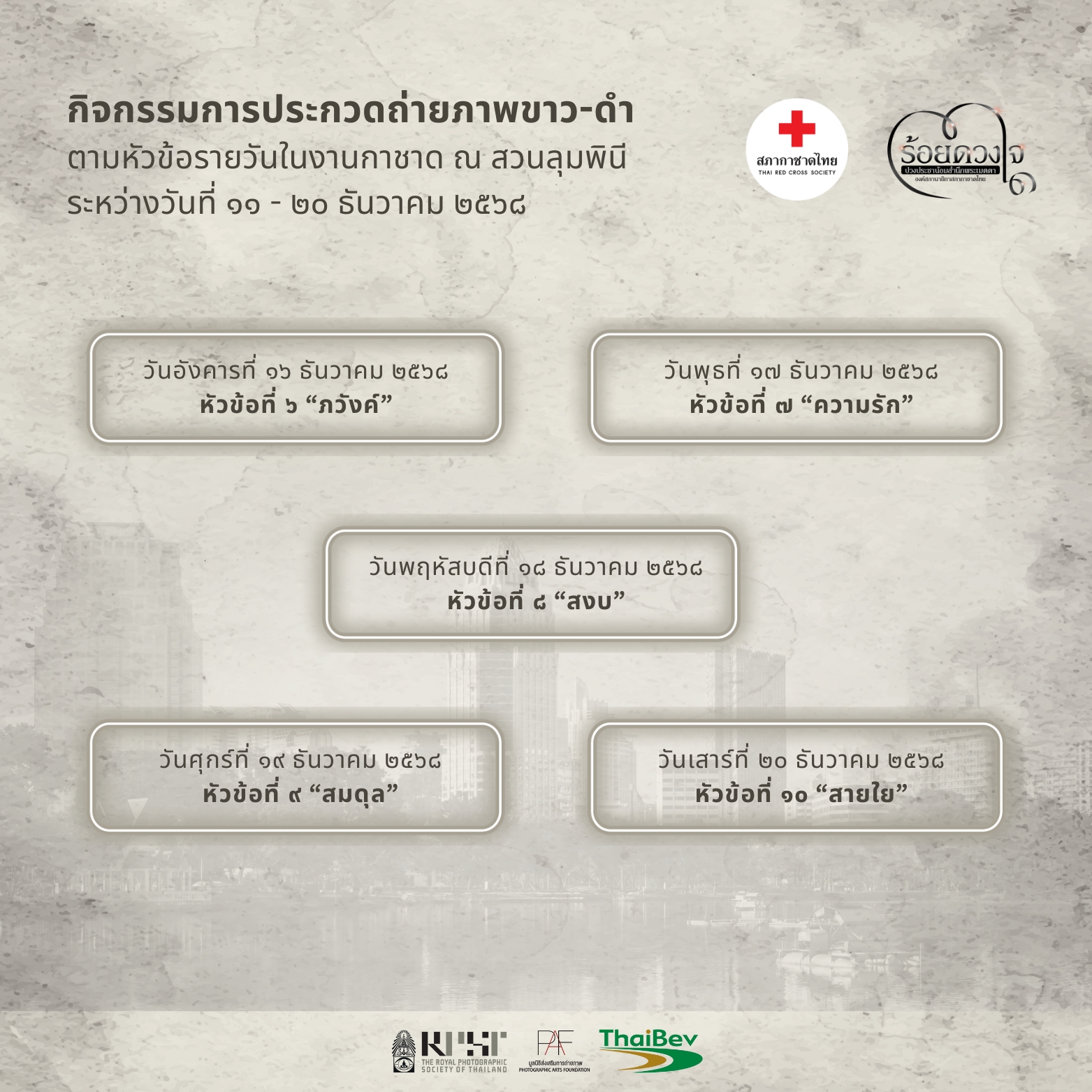 สมาคมถ่ายภาพแห่งประเทศไทย ในพระบรมราชูปถัมภ์ ร่วมกับ มูลนิธิส่งเสริมการถ่ายภาพ และบริษัท ไทยเบฟเวอเรจ จำกัด (มหาชน) ขอเชิญสมาชิกและบุคคลทั่วไปที่สนใจร่วมถ่ายทอดบรรยากาศและความประทับใจผ่านการประกวดถ่ายภาพตามหัวข้อรายวัน ในงานกาชาด ๒๕๖๘