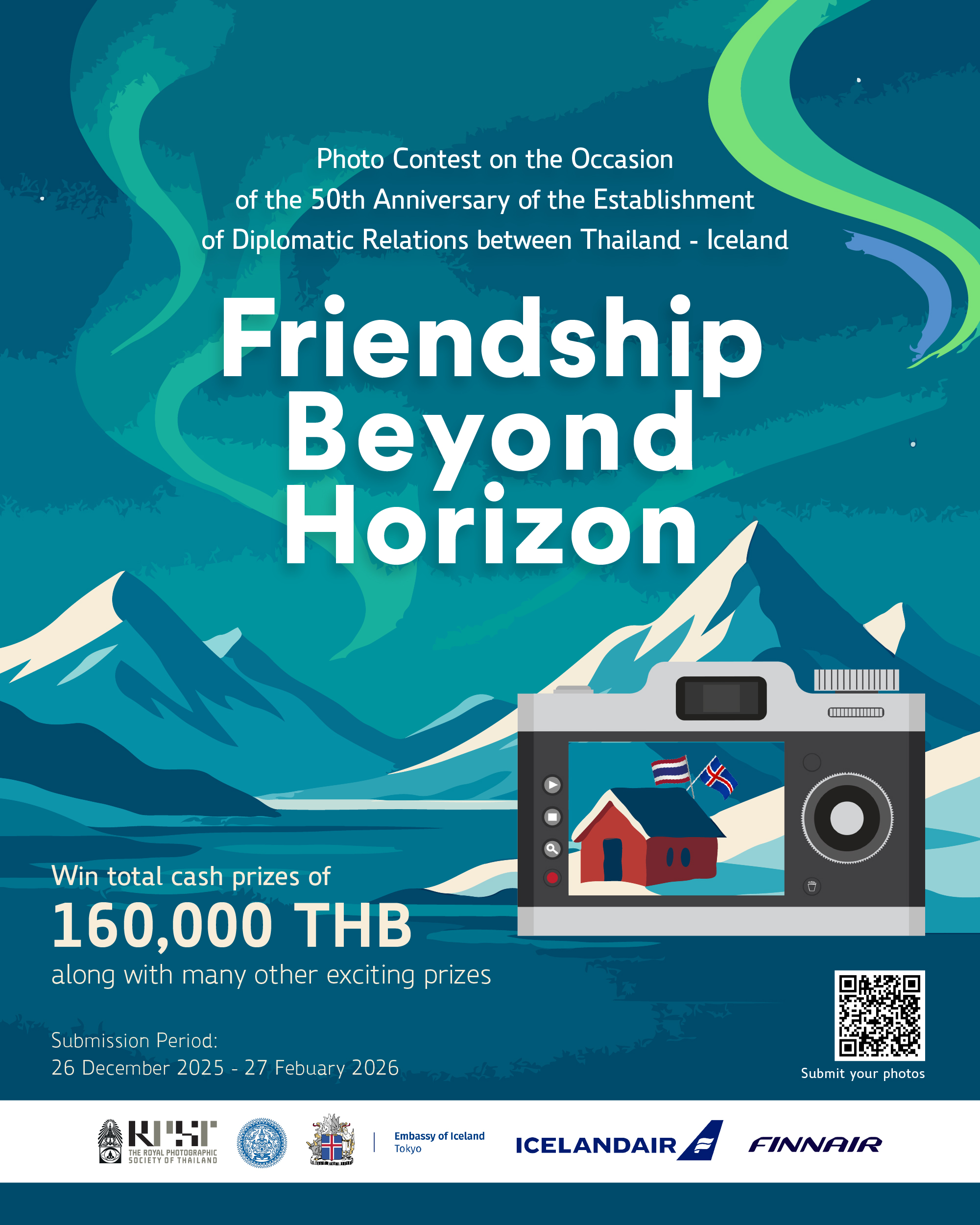 The Department of European Affairs, Ministry of Foreign Affairs, in collaboration with the Royal Photographic Society of Thailand and the Embassy of Iceland in Tokyo, which is also accredited to Thailand, is organizing a photo contest under the theme “The 50th Anniversary of the Establishment of Diplomatic Relations between Thailand – Iceland: Friendship Beyond the Horizon.” The contest offers total cash prizes worth over 160,000 THB, along with many other exciting prizes.