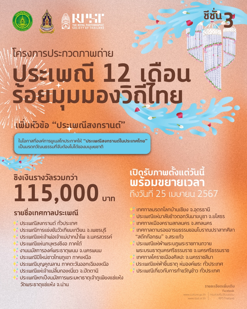 กรมส่งเสริมวัฒนธรรม กระทรวงวัฒนธรรม ร่วมกับ สมาคมถ่ายภาพแห่งประเทศไทย ในพระบรมราชูปถัมภ์ กำหนดจัดประกวดภาพถ่าย “ประเพณี 12 เดือน ร้อยมุมมองวิถีไทย” ซีซั่น 3 ชิงเงินรางวัลมูลค่ารวมกว่า 115,000 บาทโดยมีวัตถุประสงค์เพื่อรวบรวมภาพถ่ายประเพณีและเทศกาลทั่วประเทศที่มีคุณภาพ สวยงาม และภาพที่ได้จากการประกวดสามารถนำมาใช้เป็นสื่อประชาสัมพันธ์ในการร่วมอนุรักษ์ สืบสาน มรดกภูมิปัญญาทางวัฒนธรรมของชาติ เพื่อให้คนในประเทศได้ร่วมภาคภูมิใจ อีกทั้งเป็นการเผยแพร่คุณค่าสาระความงดงามของประเพณีไทย สู่นานาชาติได้เป็นอย่างดียิ่งต่อไป